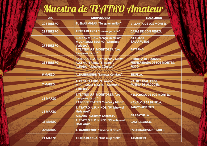 Durante todos los fines de Semana, desde el 20 de febrero hasta el 21 de marzo de 2015, se representaran obras teatrales en los distintos municipios de la Comarca, a cargo de nuestras Agrupaciones Culturales.